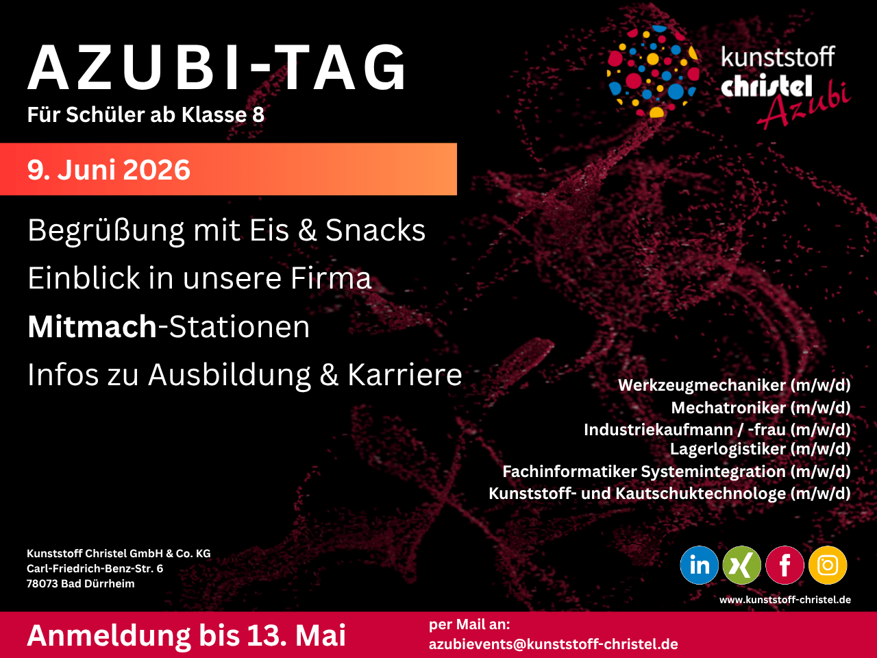 Am 09. Juni findet erstmals der Azubi Tag bei Kunststoff Christel statt. Ziel der Veranstaltung ist es, allen Auszubildenden und Interessierten einen umfassenden Einblick in verschiedene Unternehmensbereiche zu ermöglichen sowie den Austausch untereinander und mit den Fachabteilungen zu fördern.