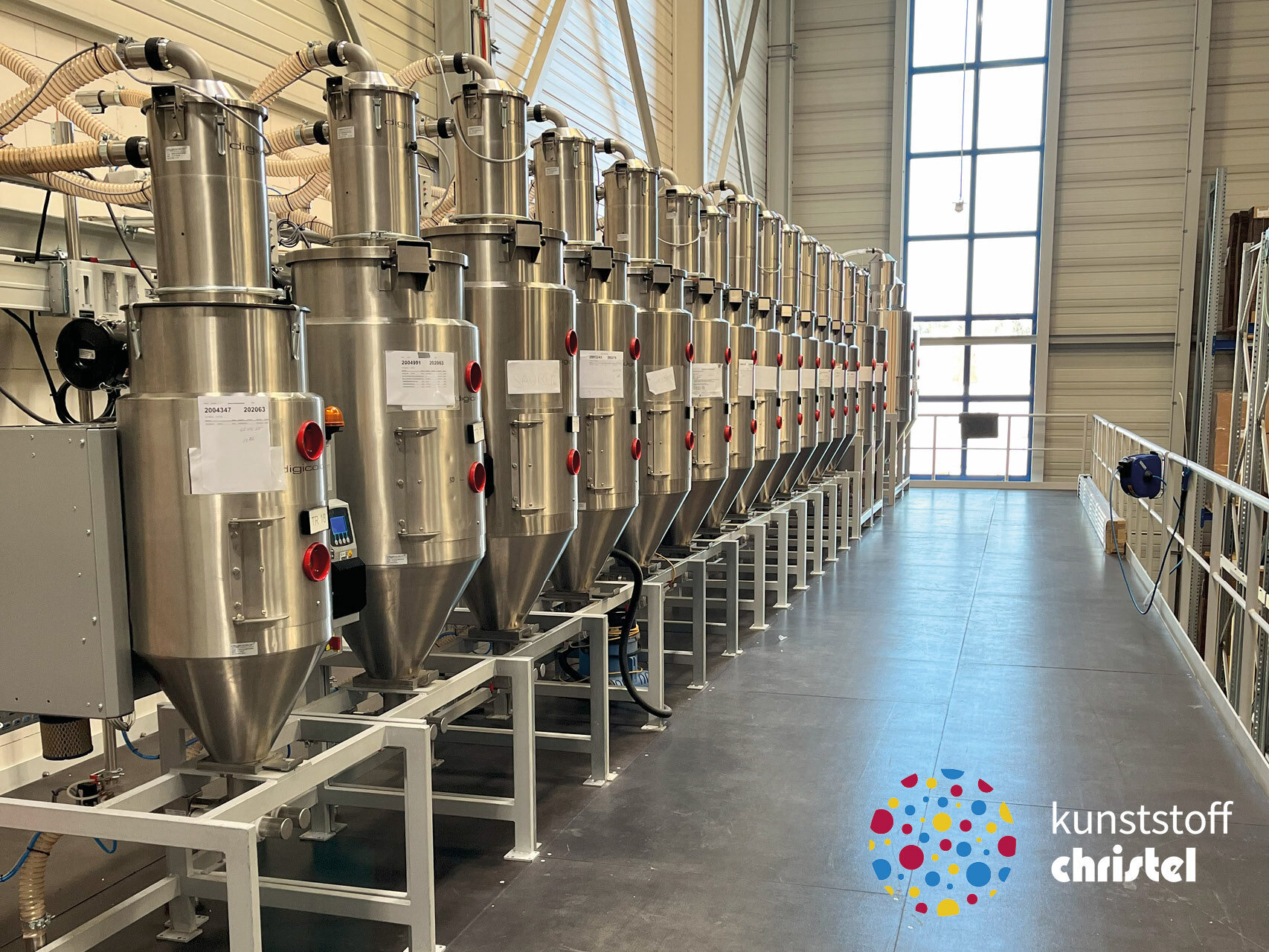 Die neue zentrale Granulatförderanlage versorgt einen Großteil unserer Großmaschinen vollautomatisch mit dem jeweils benötigten Kunststoffmaterial.